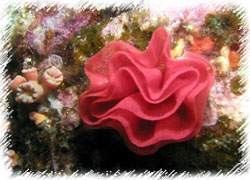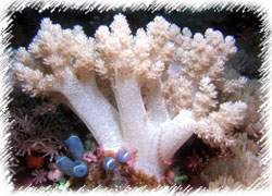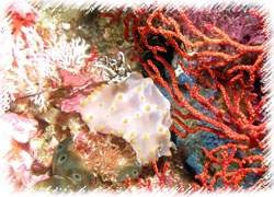 高雅的白穗軟珊瑚,右下有鮮紅色陽穗足的一隻左下有藍白相間的海鞘襯托